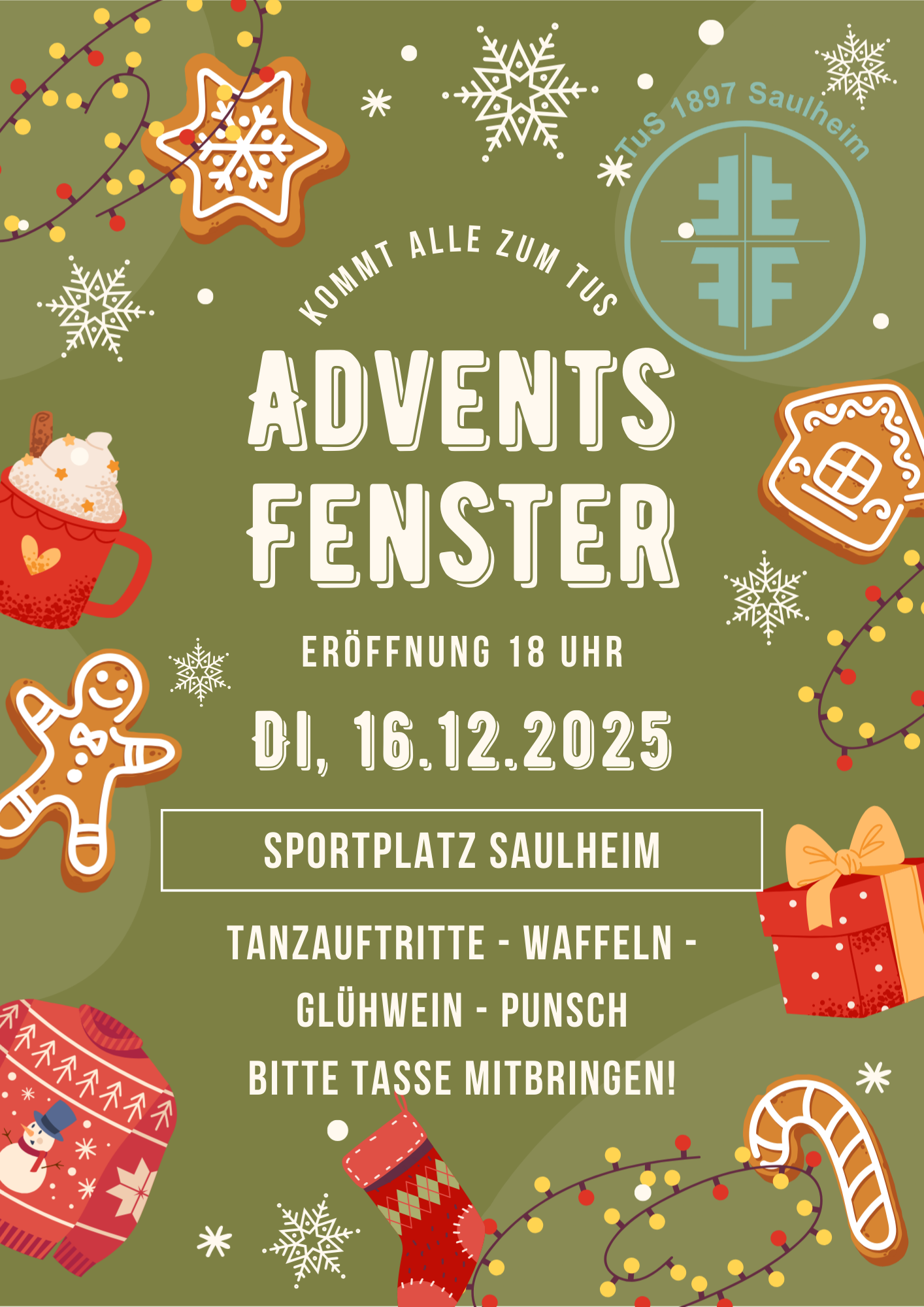 TUS Adventsfenster Uns erwarten weihnachtliche Darbietungen unserer Showtanzgruppen. Die Spendeneinnahmen aus Waffel und Glühweinausgabe gehen zugunsten unserer Tanzgruppen für neue Showtanzkostüme. Die Musikgruppe wird den Abend mit Advents-Blasmusik bereichern. Das … Weiterlesen …