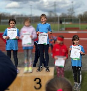 Am 28. Februar waren wir mit 13 unserer jungen Leichtathletik‑Kids bei den Regionsmeisterschaften im Crosslauf in Heidesheim am Start. Die Strecke hatte es in sich: Feldwege, eine Weitsprunggrube, Strohballen, ein kleiner Anstieg und Abschnitte durchs Stadion – perfekte Bedingungen für spannende Wettkämpfe.